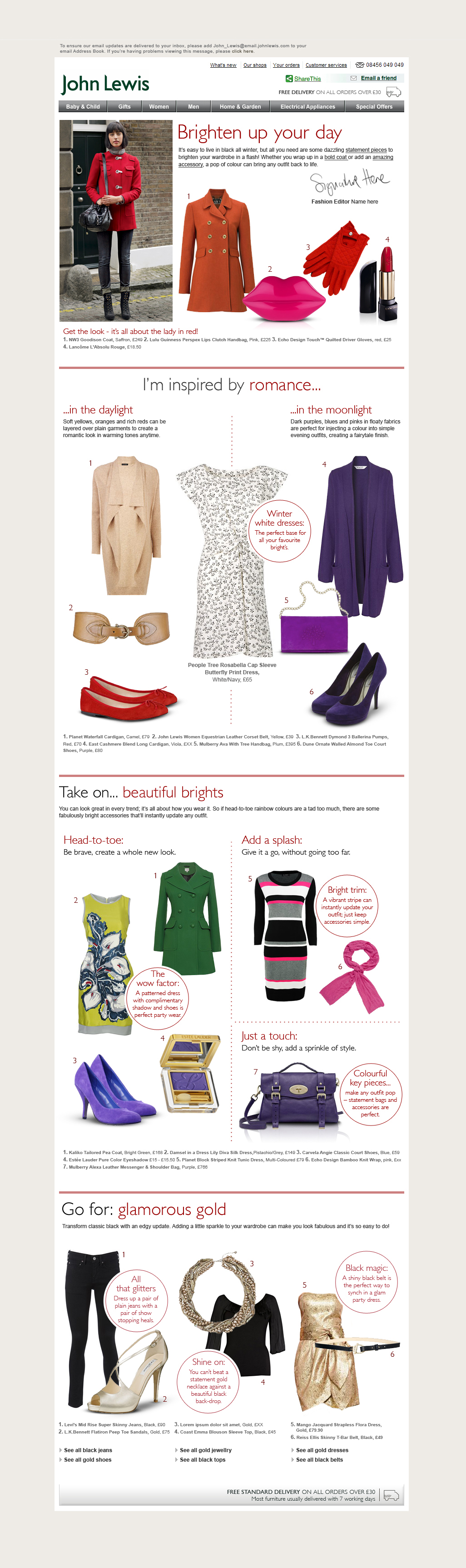 These were timed to match up with the seasonal catalogue releases. These focussed on a single key piece trend for the new season, with outfit inspiration to accessorise and complete a look. The main focus was the seasons big ticket items or must haves; winter coats, floral summer dresses or the festive season.