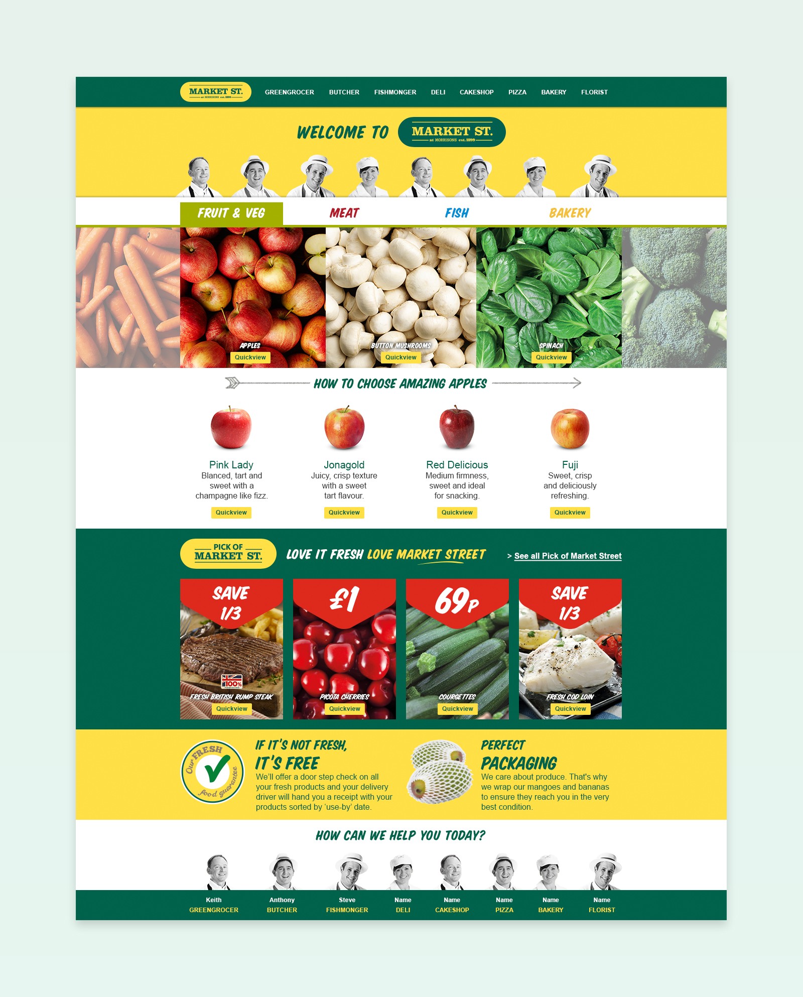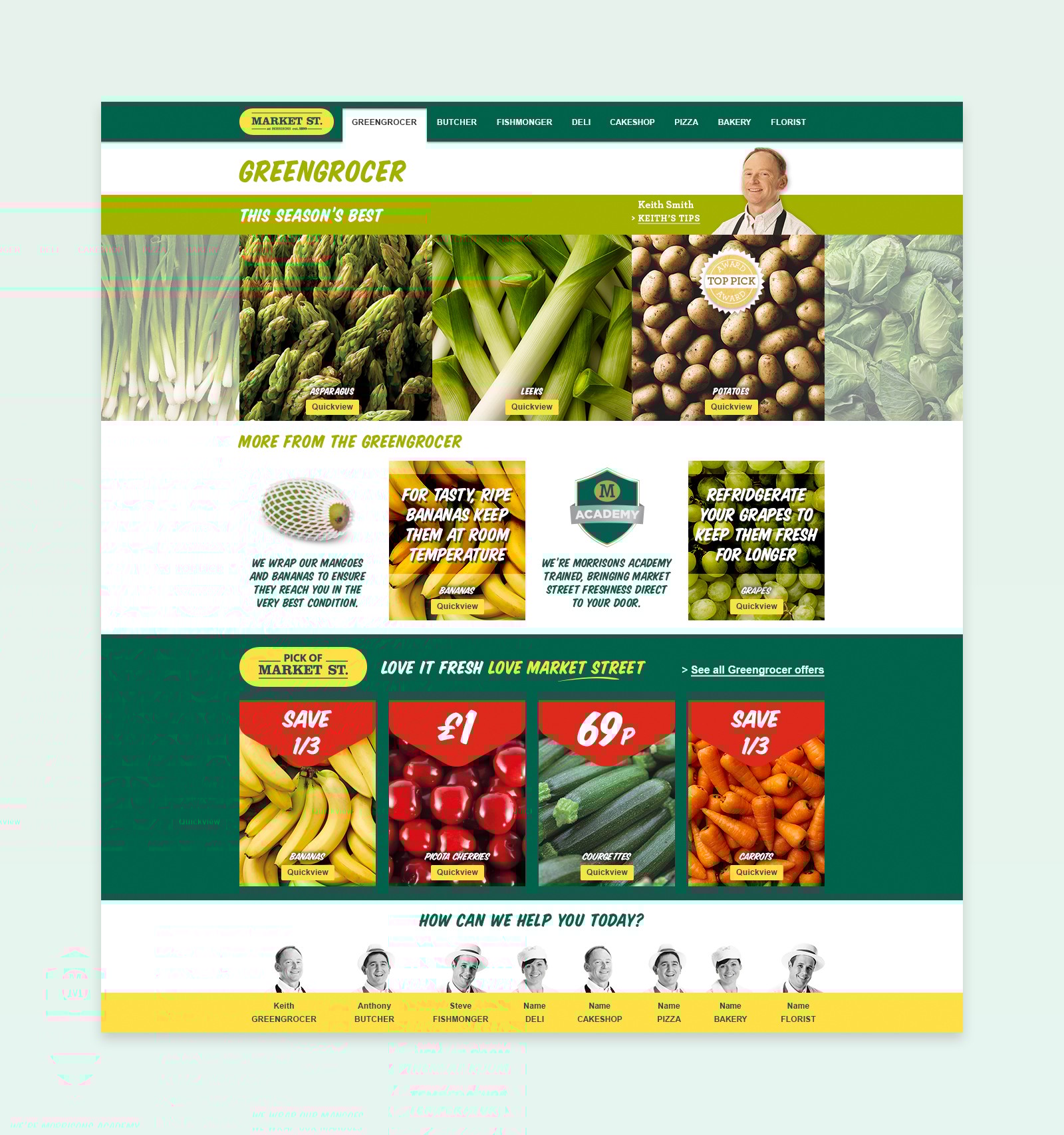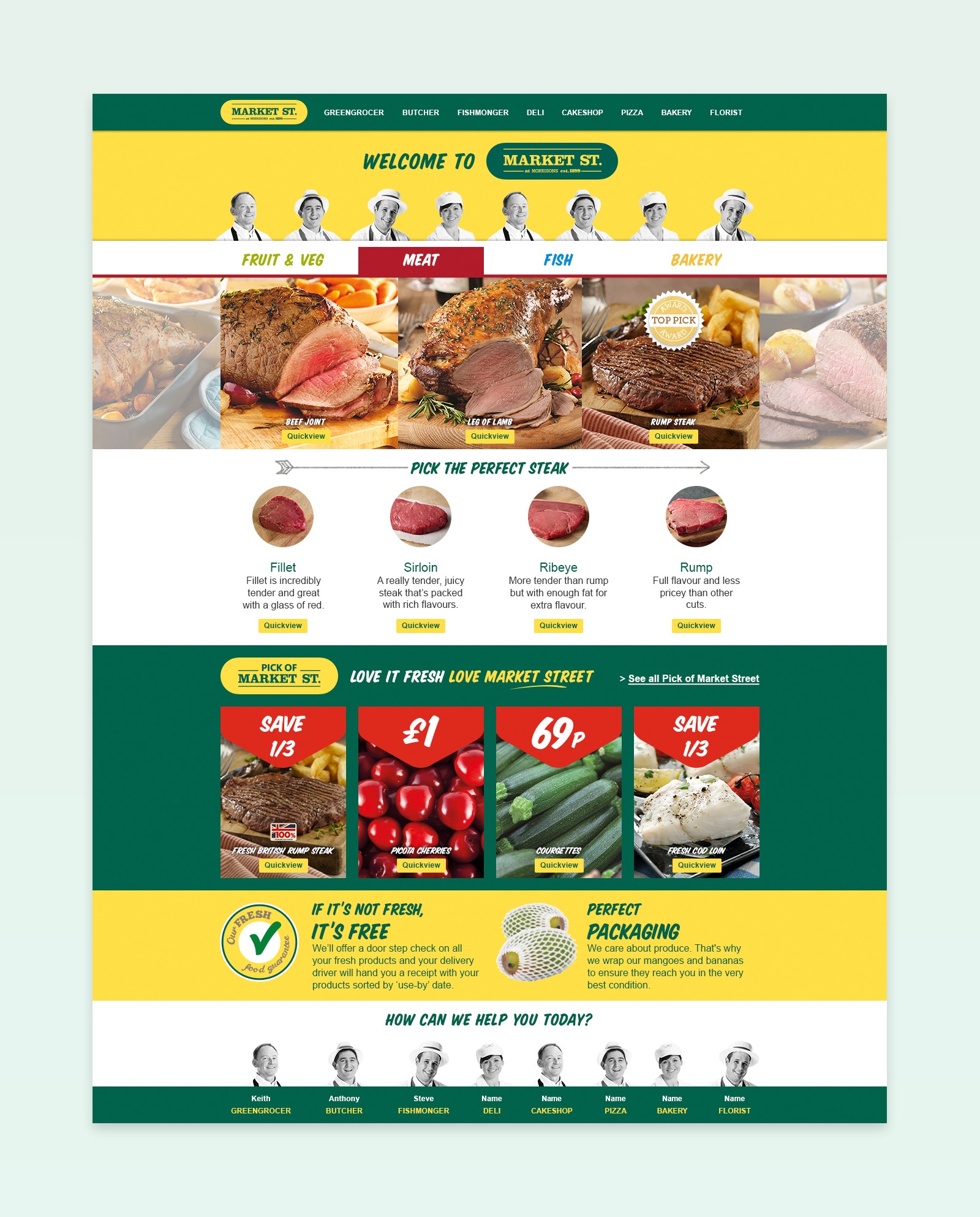 The existing website and in store experience for Market Street were very disjointed. Research showed that customers expected the online experience to be considerably closer to the in-store experience, with more emotional cues. Specifically the feeling of abundance of fresh produce, friendly in-store experts, helpful and informative signage, strong brand messages, clearly marked offers, and clearly defined sections of the store for different produce. All things that are clearly present in store and somewhat lacking on Ocado's repurposed platform.